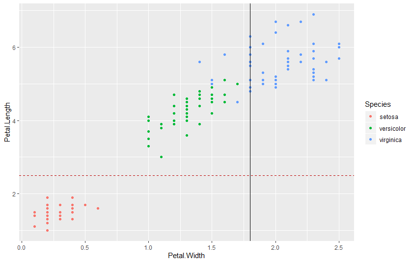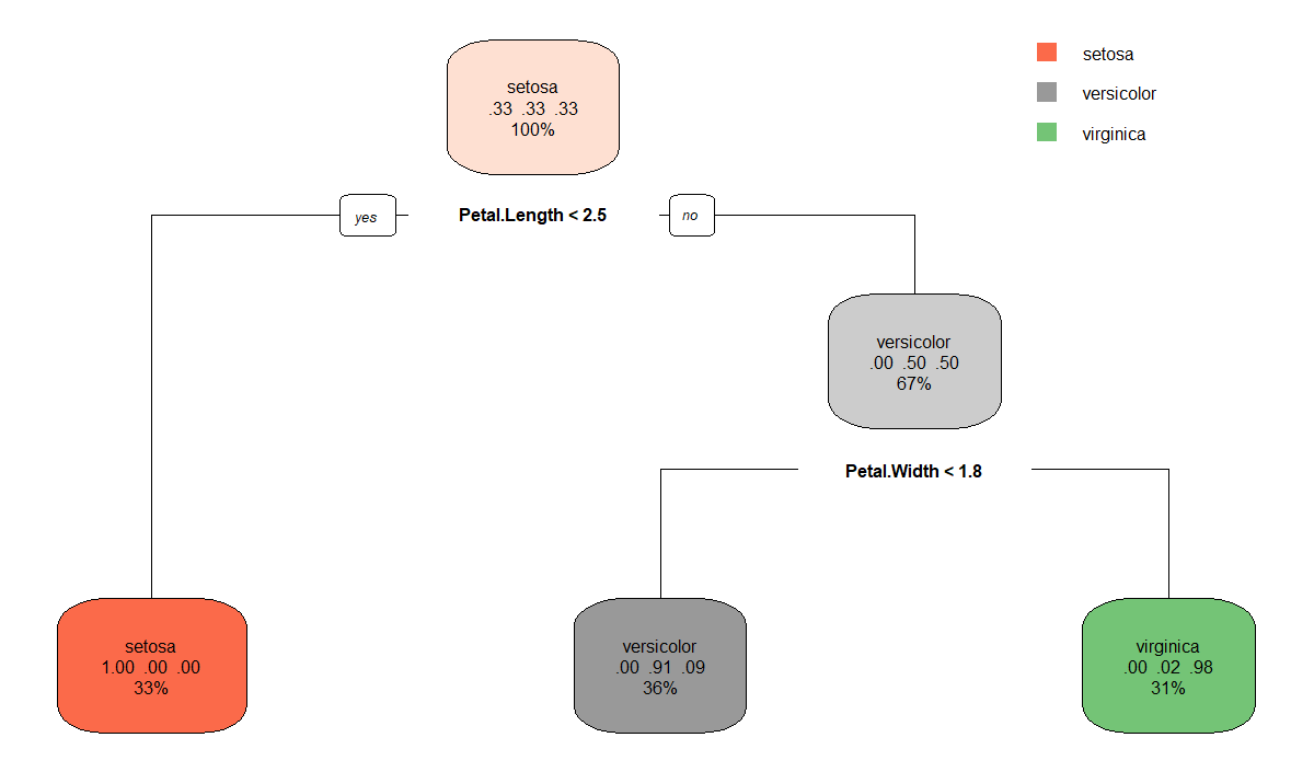 我们以鸢尾花数据集为例,比较单变量决策树和多变量决策树的拟合效果。我们以种类为响应变量,花瓣宽度和花瓣长度为特征,拟合决策树,得到决策树结果如下: