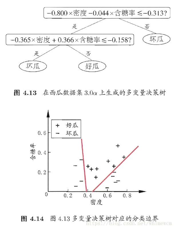 但在学习任务的真实分类边界比较复杂时,必须使用很多段划分才能获得较好的近似。多变量决策树使用斜的划分边界,在此类决策树中,非叶结点不再是仅对某个属性,而是对属性的线性组合进行测试。