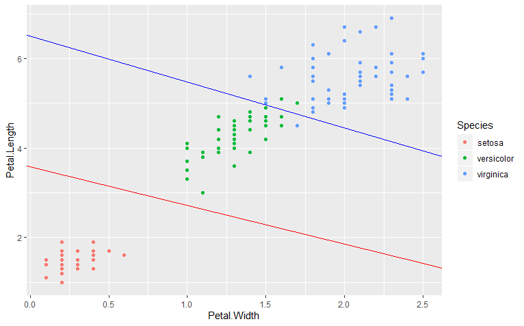 可以看到第二个区分 “versicolor” 和 “virginica” 的决策边界并不理想,存在一些误分的样本。